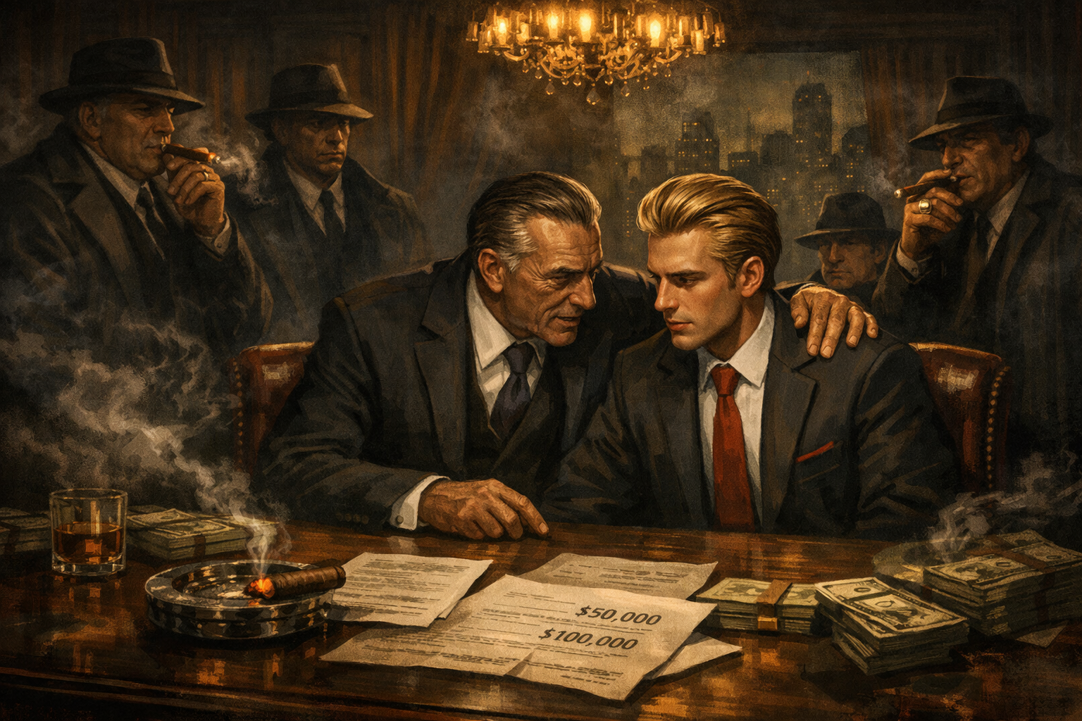 Look at that image. Really look at it. The mentor and the student. The contracts with dollar amounts on the table. The cash in stacks. The muscle standing ready in the shadows. The intimate moment of instruction while power looms behind them. The chandelier overhead, the whiskey, the smoke, the understanding that when business is conducted in rooms like this, the only thing that matters is leverage.